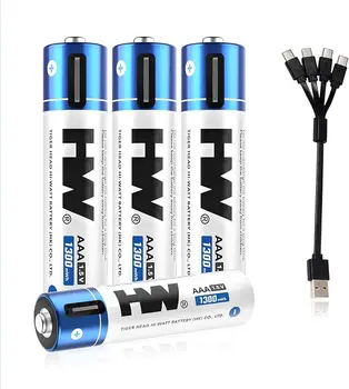 • HW 4-Pack 1300mWh USB-C Rechargeable AAA Size 10440 Lithium Polymer Batteries 1.5V Constant Output 1600 Cycles with USB-C Cable